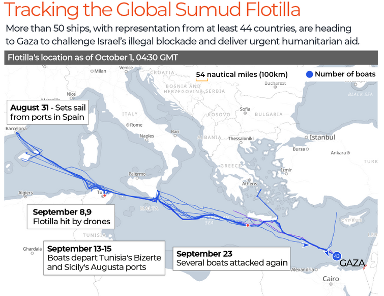A A | Flotilha: Como o mundo reage ao crime de IsraelEm vários países, população sai às ruas para rechaçar o sequestro das embarcações que levavam ajuda a Gaza. Mais de 400 ativistas estão presos. Com o genocídio impune, Tel Aviv se sente livre para violar o direito marítimo internacional e tratados de direitos humanosNo Mediterrâneo, por volta das 20h30 desta quarta-feira, as forças navais israelenses iniciaram a interceptação, em águas internacionais, de embarcações da flotilha que tentava furar o cerco aos palestinos e levar ajuda humanitária à Gaza. Já no dia seguinte, o Ministério das Relações Exteriores de Israel confirmou que todos, exceto um navio, haviam sido "neutralizados". Movimentos confirmam que 443 voluntários de 47 países foram capturados pelas forças israelenses. Brasil, Cuba, Venezuela, França, Irã, Colômbia, entre outras nações, condenam ação. Várias missões de flotilha partem para desafiar o bloqueio naval de Israel desde 2010. A mais emblemática ficou conhecida quando Israel invadiu o navio turco Mavi Marmara — parte da Flotilha da Liberdade — e cometeu um de seus inúmeros crimes de guerra, matando dez ativistas. A frota de cerca de 40 embarcações civis e 500 ativistas havia partido de portos de diversos países do Mar Mediterrâneo, no final de agosto. Desde então, os tripulantes denunciaram intimidações com drones e bombas de efeito moral contra os navios. Agora, organizadores da flotilha relatam que israelenses invadiram os barcos a cerca de 70 milhas náuticas (130 km) da costa de Gaza, cortando as comunicações e bloqueando os sinais quando a frota se aproximou do enclave sionista. Segundo informou a Agência Brasil, a delegação brasileira era composta por 17 integrantes e 11 foram capturados por Israel. Nas redes sociais, o movimento internacional Global Sumud Flotilla confirmou que entre os capturados estão o ativista Thiago de Ávila e Silva Oliveira, a deputada federal Luizianne Lins (PT-CE) e a vereadora de Campinas, Mariana Conti (PSOL-SP), além de outros oito brasileiros: Bruno Gilga. O Itamaraty se pronunciou: